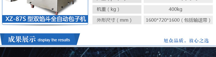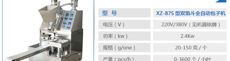 名稱XZ-87S型雙餡斗全自動包子機 電源220/380V(見機器名牌) 功率2.4kw 產量0-3600個/小時 尺寸1600*720*1600mm(包括輸送帶) 重量400kg 規格20-150克/個 其他