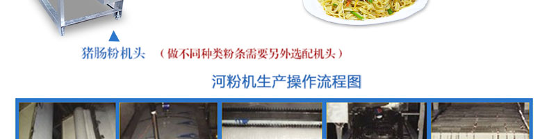 名稱SZ-HF-150高效節能河粉機 電源220/380V 功率0.75/41kw 產量60/90/120/150kg/h 尺寸主機尺寸3500*720*1050mm 外形尺寸3600*920*1500mm 重量320kg 規格粉條寬度mm:4/6/8/10 其他