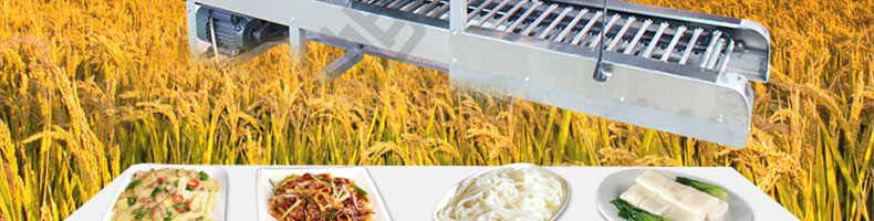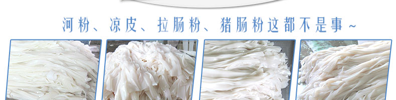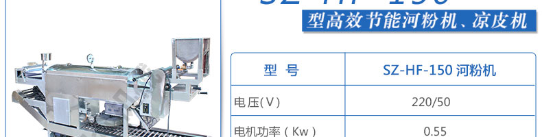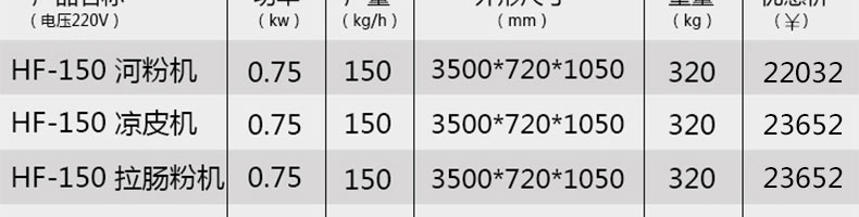 名稱SZ-HF-150涼皮機 電源220/380V 功率0.75/41kw 產量60/90/120/150kg/h 尺寸主機尺寸3500*720*1050mm 外形尺寸3600*920*1500mm 重量320kg 規格粉條寬度mm:4/6/8/10 其他