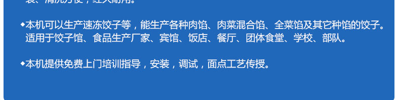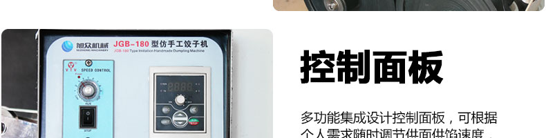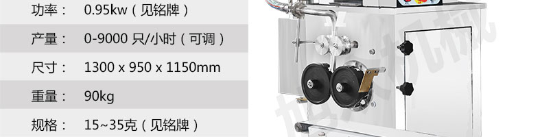 名稱JGB-180餃子機 電源220/380V(見機器名牌) 功率0.95kw 產量0-9000個/小時 尺寸外形尺寸1300*950*1150mm 重量90kg 規格15-35克/個 其他