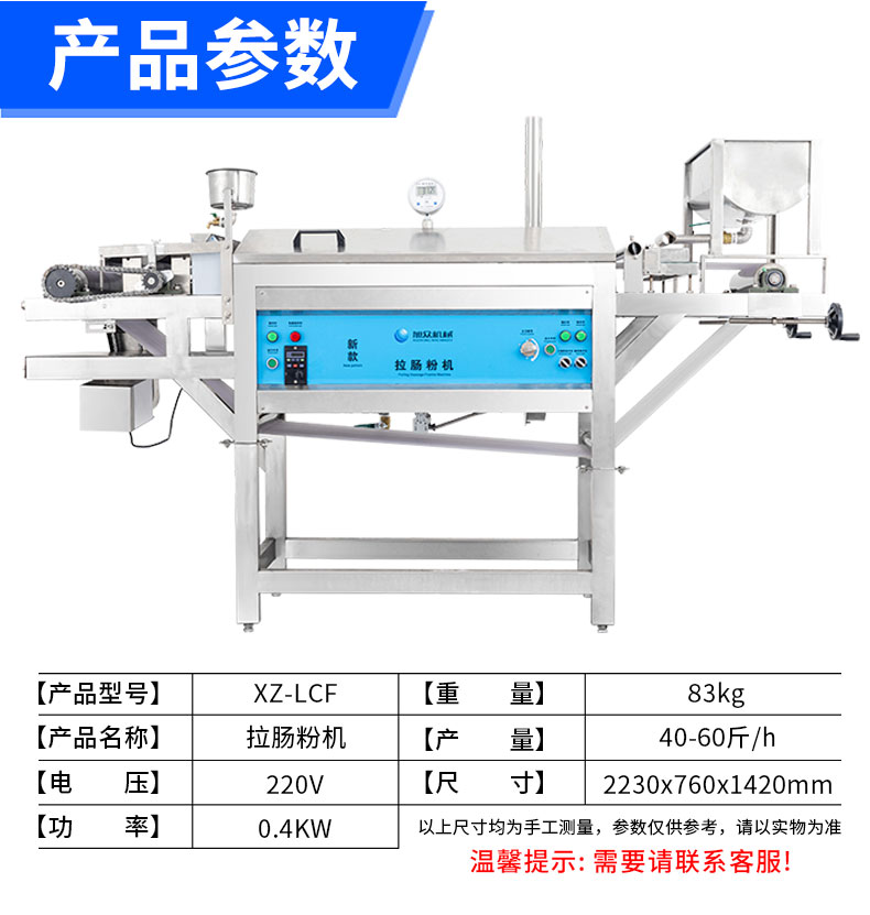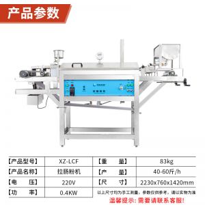 名稱XZ-LCF拉腸粉機(jī) 電源220V 功率0.4KW 產(chǎn)量40-60斤/h 尺寸2230x760x1420mm 以上尺寸均為手工測量,參數(shù)僅供參考 重量83kg 規(guī)格 其他