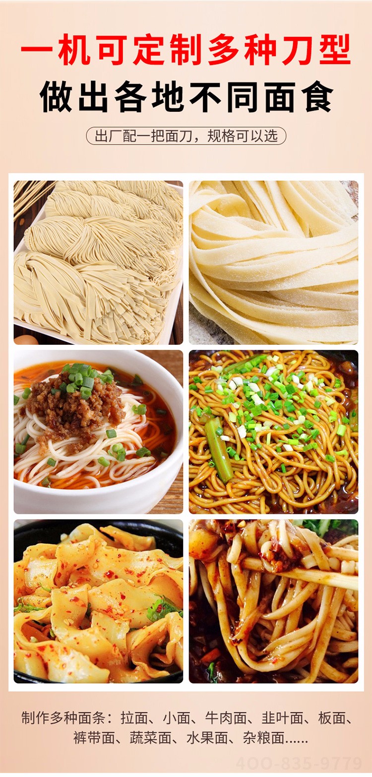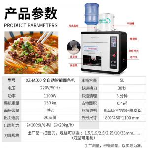 名稱全自動商用快速出面電動素面濕面M500臺式制面機器 電源220V/50Hz 功率1100W 產量出面能力≥100份小時(≥20kgh) 尺寸800*450*1100mm 重量整機重150kg,占地面積0.4m 規格面粉容量8kg,出面速度20S/份 其他刀具規格出廠配一把面刀,規格可以選:1.5/1.9/2.5/3.75/10/33mm(可訂制)