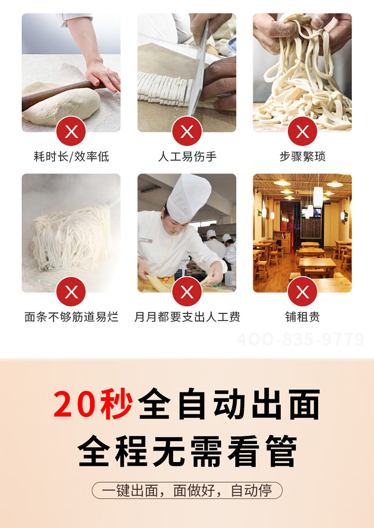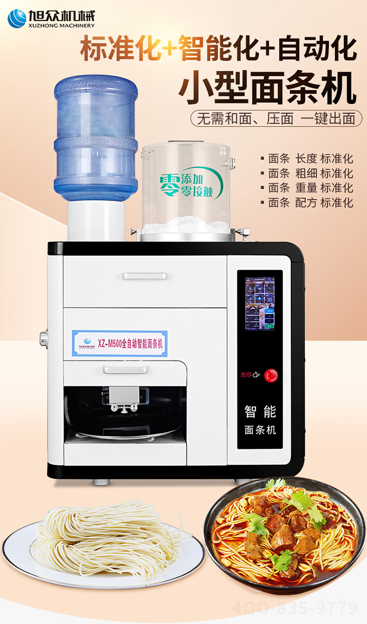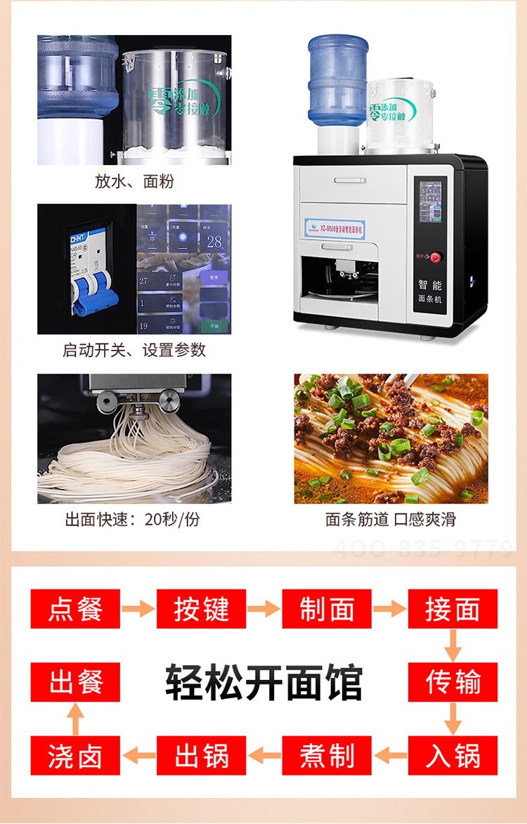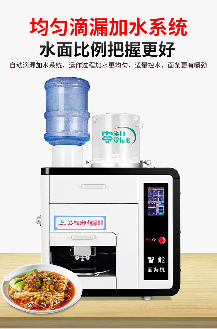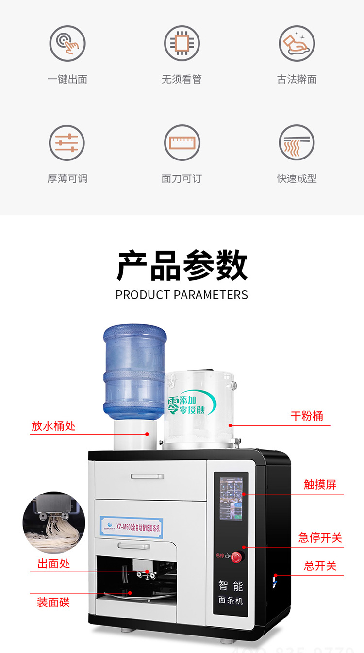 全自動商用快速出面電動素面濕面M500臺式制面機器,20秒全自動出面,全程無需看管。一鍵出面,面做好,自動停。均勻滴漏加水系統,水面比例把握更好。自動滴漏加水系統,運作過程加水更均勻,適量控水,面條更有嚼勁。