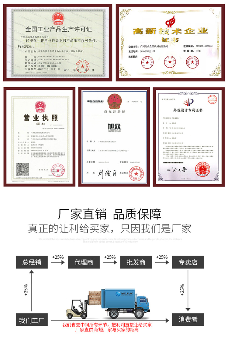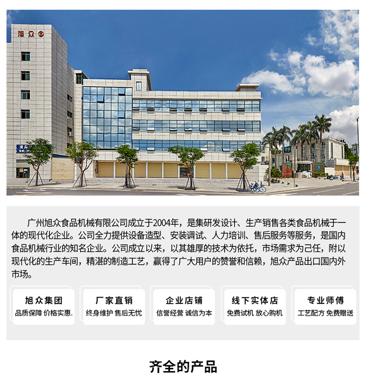 廣州旭眾食品機械有限公司是一家集科研開發,生產設計,營銷服務為一體的現代化生產企業。現代化生產車間,精湛制造技術,所產機械歷經市場重重考驗,不斷贏得海內外客戶的贊譽。