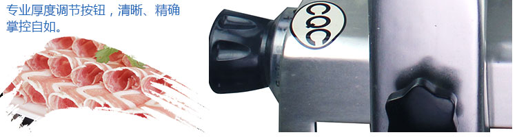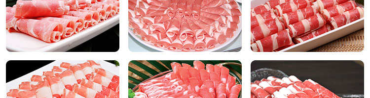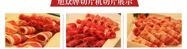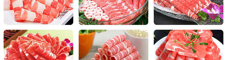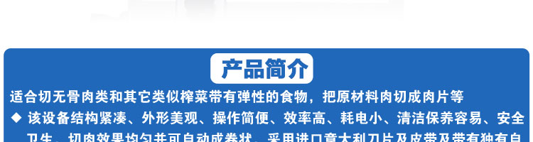 臺式全自動切片機,適合切無骨肉類和其他類似榨菜帶有彈性的食物,把原材料肉切成肉片,并可自動成卷狀。可切牛肉片、羊肉片等