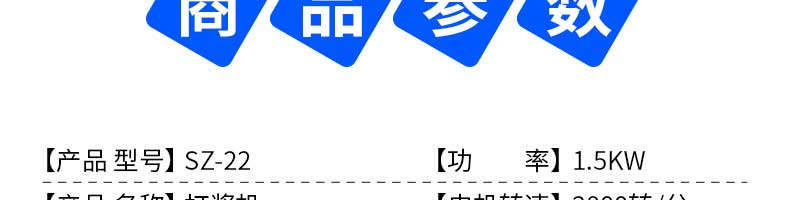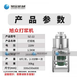 名稱SZ-22快速打漿機 電源220V 功率1.5KW 產量8斤次,2-3分鐘一次 尺寸330X300X780 重量30kg 規格聯系銷售員 其他【電機轉速】2800轉/分