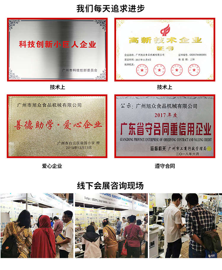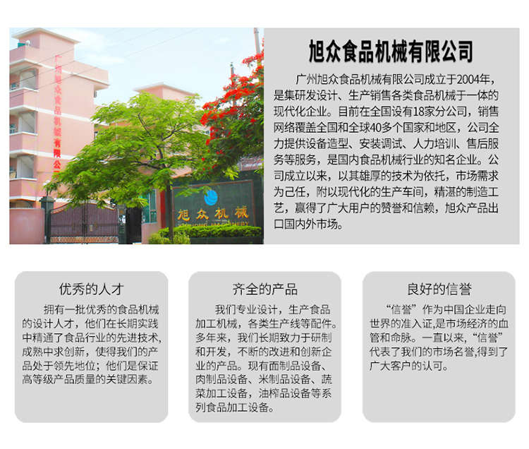 廣州旭眾食品機械有限公司是一家集科研開發,生產設計,營銷服務為一體的現代化生產企業。現代化生產車間,精湛制造技術,所產機械歷經市場重重考驗,不斷贏得海內外客戶的贊譽。